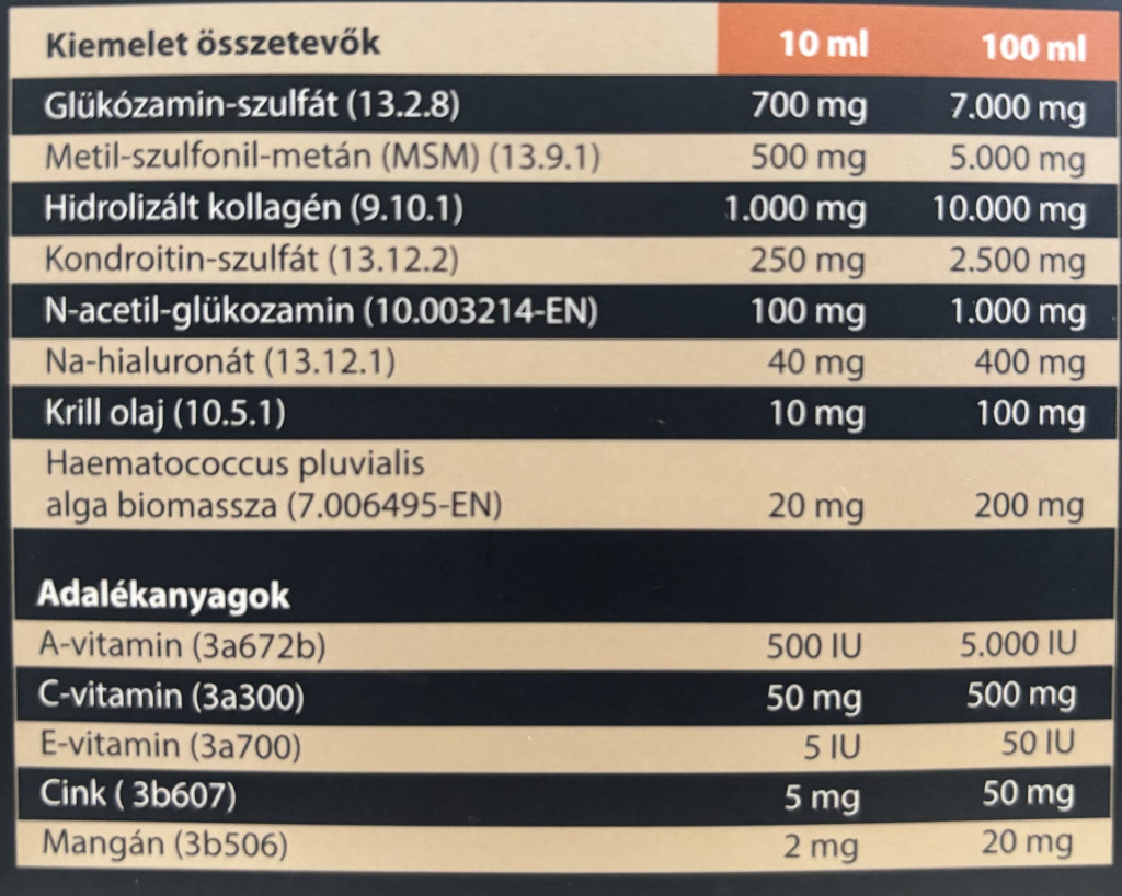 Összetevők: kollagén, glükozamin-szulfát, metil-szulfonil-metán(MSM), ízesítő anyagok (sertés termékek, cukrok, ásványi anyagok), kondroitin-szulfát, N-acetil-glükozamin, hialuronsav, Haematococcus pluvialis alga biomassza, krill olaj, egyéb alapanyagok.