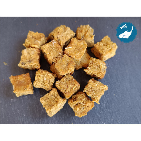 100%-ban természetes, szárított falatok tőkehallal és lazaccal. Tökéletes választás tréninghez.